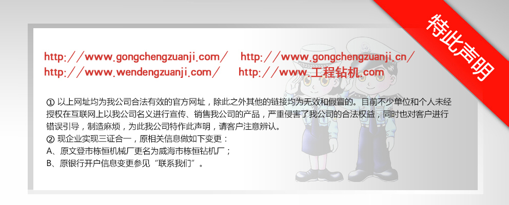 威海市棟恒鉆機(jī)廠隸屬于文登市工程鉆機(jī)廠,主要生產(chǎn)、銷售工程鉆機(jī)。它坐落于文登市西鋪頭工業(yè)園,這里科技發(fā)達(dá),交通便利,制造業(yè)集中。 自1982年建廠以來,經(jīng)過多年的優(yōu)化改革和沉淀積累,擁有精密、大型加工設(shè)備近百臺(tái)的生產(chǎn)企業(yè)之一。現(xiàn)在研制成功的GJ-400、GJ-250S、GJ-250A、GJ-240S、GJ-240A、GJ-180S、GJ-180A型等鉆機(jī)。在其它產(chǎn)品上,企業(yè)建立了長期、中期、短期的發(fā)展規(guī)劃,一系列的高性能產(chǎn)品正在不斷推出中,企業(yè)應(yīng)市場需求對(duì)系列產(chǎn)品進(jìn)行了優(yōu)化組合,開發(fā)了與之對(duì)應(yīng)配套的三腿、四腿單天車輪、雙天車輪鉆塔;泥漿泵—BW-160Q、BW- 200Q型球形閥泥漿泵大大提高了泵的使用性能和機(jī)械效率